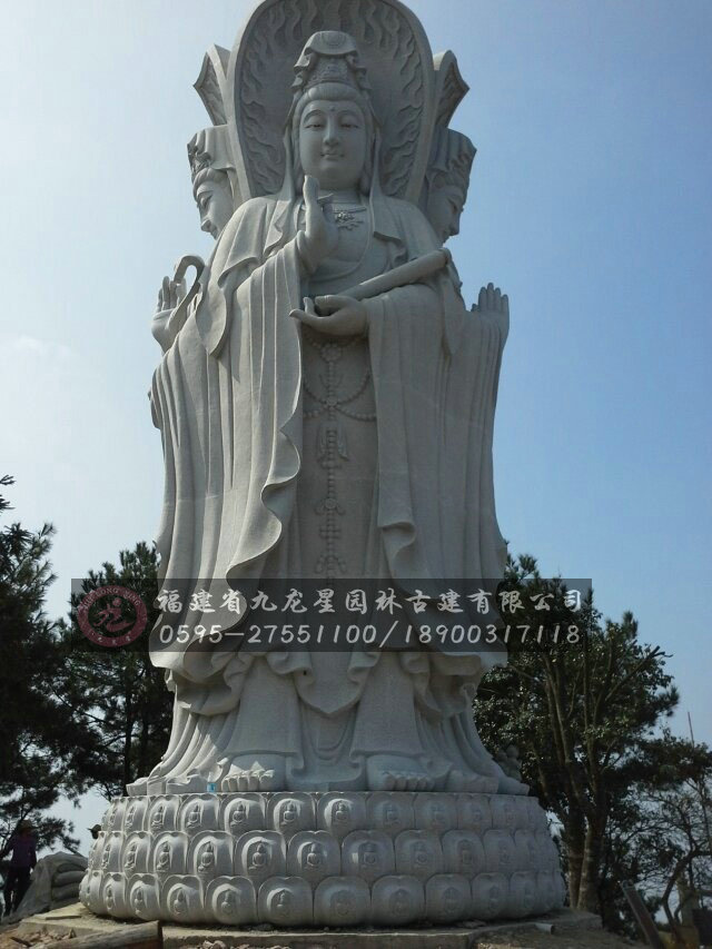 石雕三面觀音,字面意思就是一個觀音像有三個面,一般是正面的觀音手持經(jīng)篋,相鄰的右邊的觀音持蓮花,在其左面的觀音手持念珠,這三個面的觀音,手持經(jīng)篋的觀音象征這智慧,手持蓮花的觀音象征著平安,手持念珠的觀音則象征著仁慈。每一個觀音像都蘊(yùn)含著大智慧。正面的觀音體現(xiàn)著觀音的般若德即智慧德性,意思就是徹底擺脫無明煩惱和種種束縛,并且達(dá)到大自由、無束縛、大自由的境界。石雕三面觀音的整體概括智慧、慈悲、和平的精神象征。