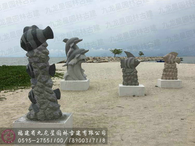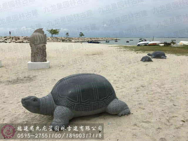 前年農(nóng)歷七月開始,海珠嶼大伯公廟這塊靠山臨海,占地10萬多方尺之地,經(jīng)過短短一年的人工美化,廟旁沙灘栽種一排排駿馬、靈鹿、孔雀、鳳凰等飛禽走獸的造型盆景,游客穿梭在植物走道弄潮看夕陽。沙灘上豎立起海龍王、蝦兵蟹將及石龜?shù)仁裥Σ[瞇與游客合照。來自中國惠安九龍星園林古建陳沂泉先生承包并制作該石雕工程項(xiàng)目。