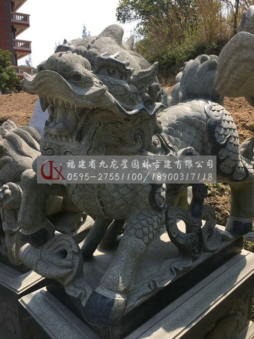麒麟造型中石刻麒麟多在建筑、皇家建筑里出現,其體型巨大,多以威武雄健之態出現。這說明,麒麟造型的比例尺寸大小是與特定的環境、風俗、情感相聯系的。石雕麒麟的大也可以解釋為大氣、圣威、權利,具有震懾的作用。石雕麒麟的造型遵循著傳統文化審美的習慣,麒麟的造型特征說明其造物意象充滿了對美好與吉祥的期望。石雕麒麟的整個造型集龍頭、鹿角、獅眼、虎背、熊腰、蛇鱗、馬蹄、豬尾于一身,另外使用添加手法在下頜處加有長長的胡須,又添加翅膀,這樣,麒麟可以奔跑,可以飛翔,威武之勢讓人可望不可及。麒麟體現了古人對現實世界的主觀理想與造物的主動性,其和龍、鳳一樣成了我國傳統民族精神的象征。還有,石雕麒麟的擺放一般是成雙成對出現的,主要因為其造型講究碩大豐滿,還注重陰陽相守,忌諱殘缺不全、形單影只,其中寄托了人們“天人和諧”的精神追求,內涵獨特而豐富。