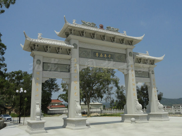 石雕牌坊是用石材修建的一種建筑類型,不僅結構自成一格,別具風采,而且集雕刻、繪畫、匾聯文辭和書法等多種藝術于一身,熔古人的社會生活理念、封建禮教、封建傳統道德觀念、古代的民風民俗于一爐,具有瑰麗的藝術魅力、很高的審美價值和豐富而深刻的歷史文化內涵。每一座石雕牌坊都是一件石雕工藝品,中國傳統的石雕技法圓雕、透雕、高浮雕、淺浮雕、平浮雕、陰線刻等,在石雕牌坊的雕刻中都廣為應用。