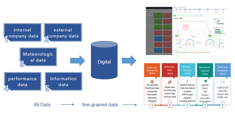 Aiming at exploring digitalization, automation, and intelligence, D-FOC (Digital Flight Operations Control System) is a Data-driven Operations Control system, and an integrated platform to assist Airlines with operational, flight administrative, maintenance and ground service, intelligently integrate a variety of data from ATC, crew resources, MCC (maintenance control center), terminal, and other considerations, to achieve production system intelligence and integration, to provide Airlines with a new generation of operations control and dispatch solutions in order to guarantee enhanced safer flight operations..