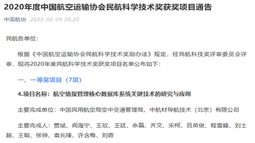 2022年2月9日,中國航空運(yùn)輸協(xié)會發(fā)布了2020年度民航科學(xué)技術(shù)獲獎項目公告。由中國民用航空局空中交通管理局與中航材導(dǎo)航技術(shù)(北京)有限公司合作研發(fā)的《航空情報管理核心數(shù)據(jù)庫系統(tǒng)關(guān)鍵技術(shù)的研究與應(yīng)用》項目榮獲一等獎,這是我公司在推動科技進(jìn)步與生產(chǎn)創(chuàng)新方面取得的最高獎項,也是我國民航情報領(lǐng)域近20年來獲得行業(yè)最高獎項。