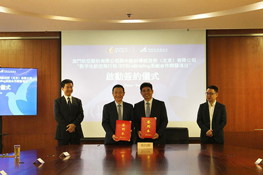 2023年12月1日,澳門航空股份有限公司(以下簡稱“澳門航空”)與中航材導航技術(北京)有限公司(以下簡稱“中導航”)在澳門航空總部舉行了隆重的eBriefing項目簽約儀式。