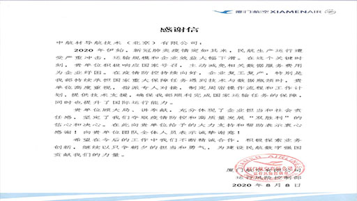 近期,中航材導航技術(北京)有限公司(以下簡稱“公司”)收到了一封來自廈門航空有限公司運行風險控制部發(fā)來的感謝信。信中對公司在2020年新冠肺炎疫情期間,積極響應國家號召,顧大局、講奉獻,主動減免相關數(shù)據(jù)服務費用及在助力企業(yè)復工復產(chǎn)中提供的技術支援表示了感謝。正文如下: