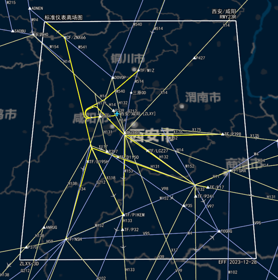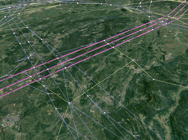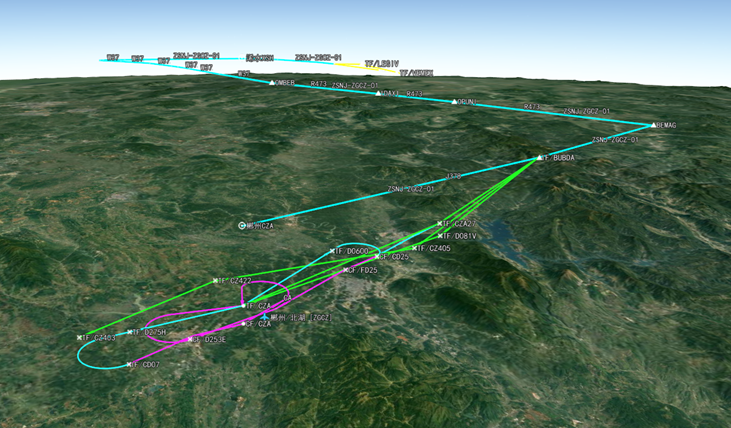 展示班機(jī)航線走向、所有途徑點(diǎn)、及圖形。并根據(jù)班機(jī)航線始、末航路點(diǎn)匹配機(jī)場進(jìn)、離場和進(jìn)近程序顯示,顯示航線截點(diǎn)信息。